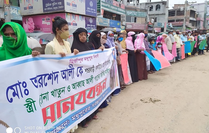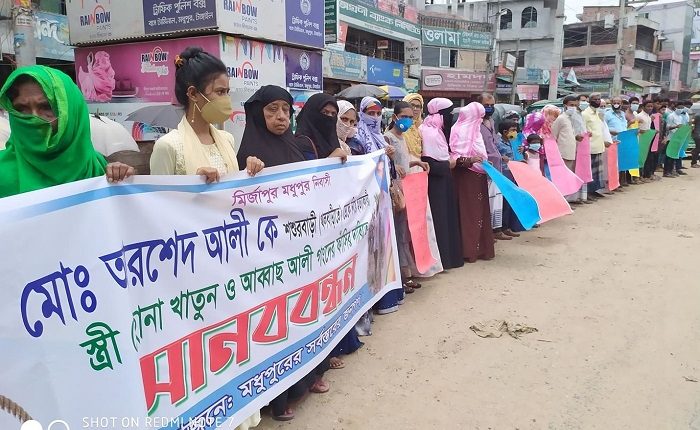 বৃহস্পতিবার (২জুলাই) সকাল ১০টার দিকে মধুপুর বাসস্ট্যান্ড আনারস চত্বরে মধুপুরবাসীর আয়োজনে এ মানববন্ধন কর্মসুচি পালিত হয়। মানববন্ধনে নিসংশ এই হত্যা ঘটনায় স্ত্রী রেহেনা, আব্বাছ, শ^শুর ও শ্যালক স্বপনকে ফাঁসির দাবি জানানো হয়েছে।
