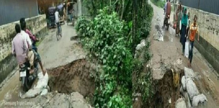 সেখানে রাস্তাটি ভেঙ্গে প্রায় ৬/৭ফুট খাদের সৃষ্টি হওয়ায় গত এক সপ্তাহ যাবত পণ্যবাহী ট্রাক চলাচল বন্ধ আছে। এরপর স্থানীয় লোকজন কয়েকটি বালির বস্তা দিয়ে পথচারী ও রিক্সা যাতায়াতের ব্যবস্থা করলেও অসুস্থ রোগী সহ সকলকে জীবনের ঝুঁকি নিয়ে চলাচল করতে হচ্ছে। এছাড়াও রাস্তাটির মাঝে ছোট ফুলবাড়ি ইয়াকুব মোড়, মসজিদের উত্তর মোড়, করতোয়া নদীর পূর্বধারে শ^শান মোড়, ফুলবাড়ি দহপাড়া মোড় সহ প্রায় পনেরটি স্থানে রাস্তায় ঝুঁকিপূর্ণ অবস্থার সৃষ্টি হয়েছে। ফলে সীমাহীন দূর্ভোগ পোহাতে হচ্ছে এলাকাবাসীর।