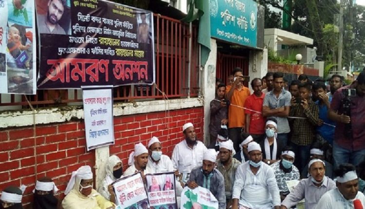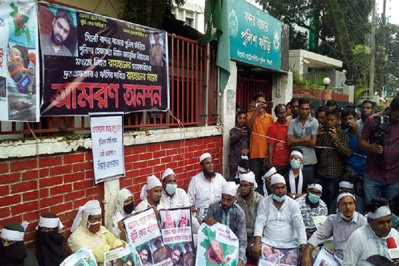 সিলেটে নির্যাতনে রায়হানের মৃত্যুর ঘটনায় অভিযুক্ত পুলিশের এসআই আকবর ভূঁইয়াসহ দোষীদের গ্রেপ্তার ও বিচারের দাবিতে আমরণ অনশন করছেন রায়হানের মা ও তার স্বজনরা। এ সময় রায়হানের মায়ের হাতে একটি প্ল্যাকার্ড দেখা যায়। তাতে লেখা রয়েছে- ‘আমার ছেলে কবরে খুনি কেন বাইরে?’