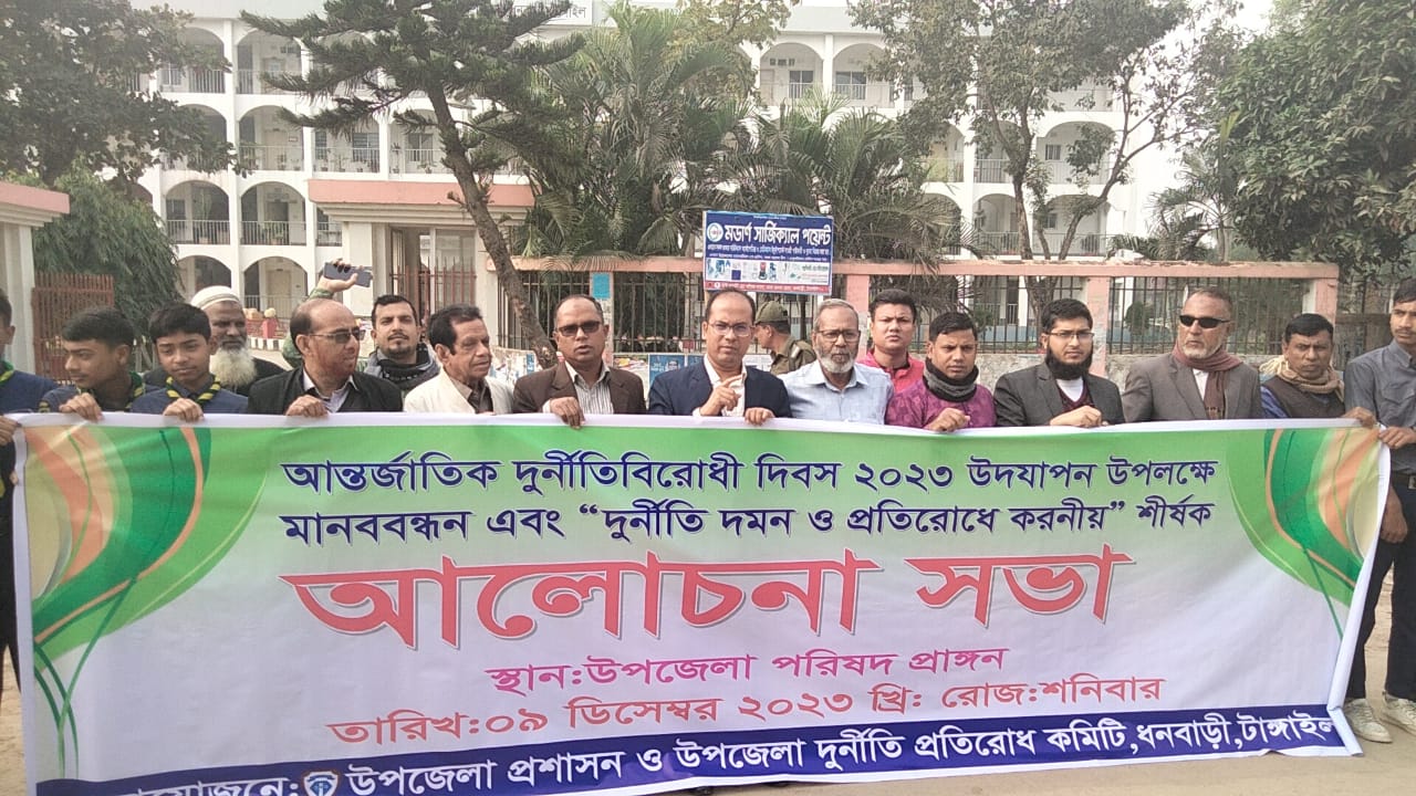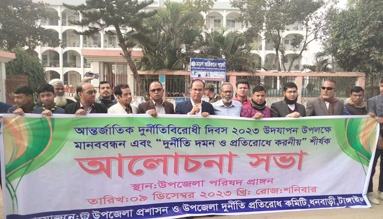 গতকাল ধনবাড়ী উপজেলা পরিষদ চত্বরে মানববন্ধন ও সকাল ১০টায় উপজেলা চত্বরে জাতীয় সংগীত এবং জাতীয় পতাকা উত্তোলনের পরে আলোচনাসভায় অনুষ্ঠিত হয়। উপজেলা দুর্নীতি প্রতিরোধ কমিটির সভাপতি আশরাফ হোসেন এর সভাপতিত্বে ‘দুর্নীতি দমন ও প্রতিরোধে করনীয়’ শীর্ষক আলোচনা করেন, ধনবাড়ী উপজেলার নির্বাহী অফিসার মোঃ আসলাম হোসাইন।