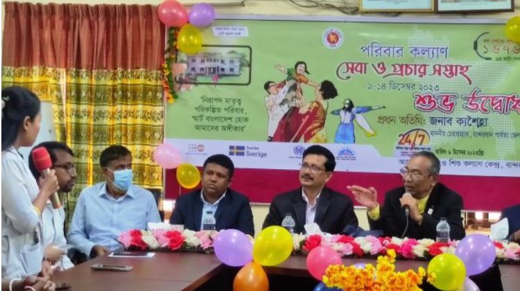 প্রতি বছরের মতো এবারও বান্দরবানে পরিবার কল্যাণ সেবা ও প্রচার সপ্তাহ উদযাপন করা হচ্ছে। ‘নিরাপদ মাতৃত্ব পরিকল্পিত পরিবার, স্মার্ট বাংলাদেশ হোক আমাদের অঙ্গীকার’ এ প্রতিপাদ্যকে সামনে রেখে শনিবার (৯ ডিসেম্বর) সকালে মা ও শিশু কল্যাণ কেন্দ্রের মিলনায়তনে এক আলোচনা সভা অনুষ্ঠিত হয়। আলোচনা সভায় বান্দরবান পরিবার পরিকল্পনা কেন্দ্রের উপপরিচালক দীপক কুমার সাহা এর সভাপতিত্বে প্রধান অতিথি হিসেবে উপস্থিত ছিলেন বান্দরবান পার্বত্য জেলা পরিষদের চেয়ারম্যান ক্যশৈহ্লা। এসময় অন্যান্যদের মধ্যে সহকারী কমিশনার মিজানুর রহমান, পরিবার পরিকল্পনা বিষয়ক কনভেনিং কমিটির আহ্বায়ক ও পার্বত্য জেলা পরিষদের সদস্য দুংড়িমং মার্মাসহ সাংবাদিকরা উপস্থিত ছিলেন।