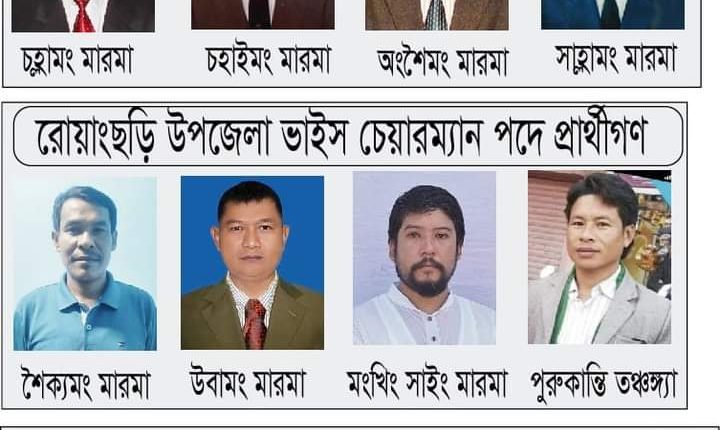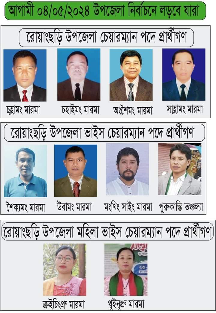 খোঁজ নিয়ে জানা গেছে, উপজেলা নির্বাচনে এপ্রিল ও মে মাসের মধ্যে নির্বাচন হওয়ার সম্ভাবনা রয়েছে। এরপর উপজেলা আওয়ামী লীগে প্রায় সম্ভাব্য প্রার্থীরা কৌশলে মাঠে নেমে পড়েছেন। তারা শুরু করেছেন নির্বাচনী তৎপরতা। এরমধ্যে এখন পর্যন্ত যাদের নাম শোনা যাচ্ছে। চেয়ারম্যান পদে দলীয় ছাড়া ২ জনসহ রয়েছেন ৪জন। তারা হলেন উপজেলা আওয়ামী লীগের সভাপতি চহ্লামং মারমা, উপজেলা আওয়ামী লীগের সহসভাপতি ও বর্তমান উপজেলা চেয়ারম্যান চহাইমং মারমা, ১নং রোয়াংছড়ি সাবেক ইউপি চেয়ারম্যান ও উপজেলা পিসিজেএসএস এর উপজেলা সভাপতি অংশৈমং মারমা, সাবেক ইউপি চেয়ারম্যান সাহ্লামং মারমা।
