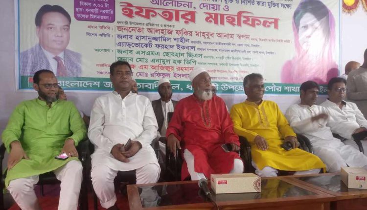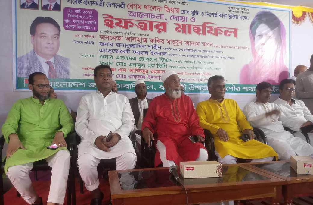 টাংগাইলর ধনবাড়ী উপজেলার পৌর বিএনপির উদ্যৌগে সাবেক প্রধানমন্তী ও দেশনেত্রী বেগম খালেদা জিয়ার রোগমুক্তি ও নি:শর্ত কারা মুক্তির লক্ষ্যে আলোচনা দোয়া ও ইফতার মাহফিল অনুষ্ঠিত হয়েছে।