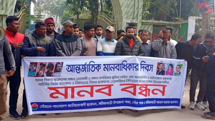 মঙ্গলবার (১০ডিসেম্বর) সকাল ১১টায় সরিষাবাড়ী অনার্স কলেজ গেটে বাংলাদেশ জাতীয়তাবাদী ছাত্রদল সরিষাবাড়ী উপজেলা শাখার সদস্য সচিব মাসুদ রানা চপলের সঞ্চালনায় মানববন্ধনে উপজেলা ছাত্রদলের আহব্বায়ক খায়রুল ইসলাম বিদ্যুৎ এর সভাপতিত্বে বক্তব্য রাখেন;জেলা ছাত্রদলের সহ-সভাপতি আরিফ মিয়া, উপজেলা ছাত্রদলের সাবেক সভাপতি হাফিজুর রহমান মিলন, পৌর ছাত্রদলের আহ্বায়ক আব্দুল আলীম সবুজ, সদস্য সচিব মানিক মিয়া,ও কলেজ ছাত্রদলের সদস্য সচিব মিনহাজ আহমেদ।