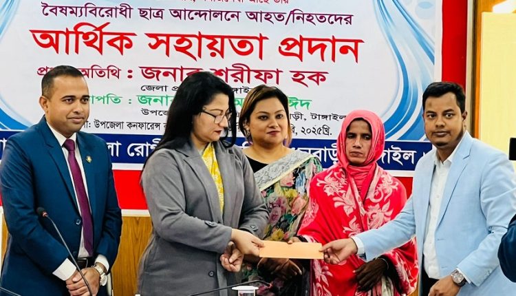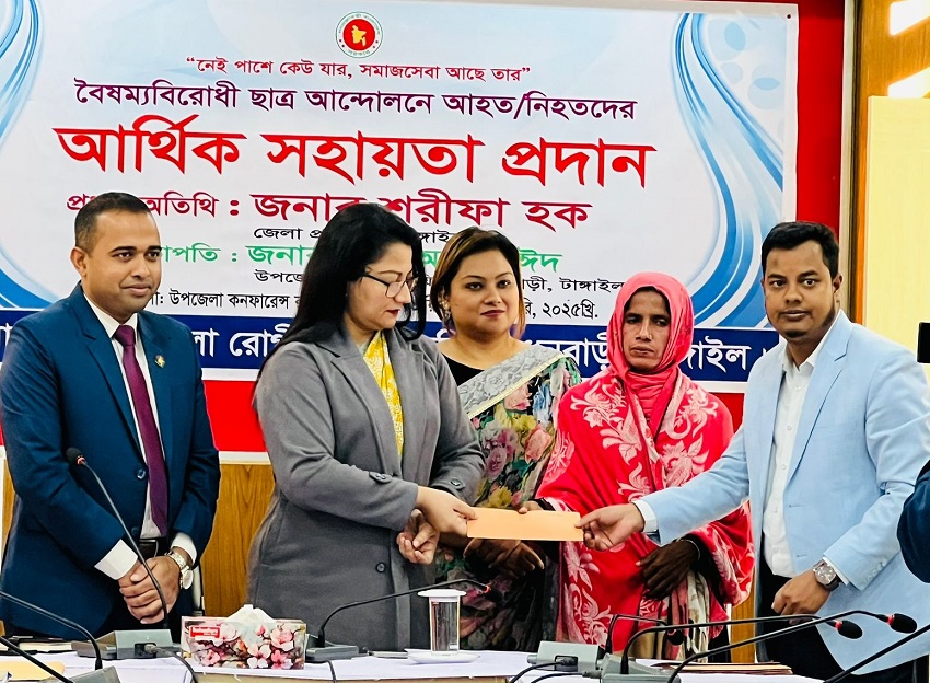 “নেই পাশে কেউ যার, সমাজসেবা আছে তার” এই প্রতিপাদ্য টাংগাইলের ধনবাড়ীতে বৈষম্যবিরোধী ছাত্র আন্দোলনে আহত/নিহতদের আর্থিক সহায়তা প্রদান করেন টাংগাইলের জেলা প্রশাসক শরীফা হক।