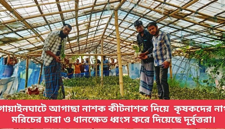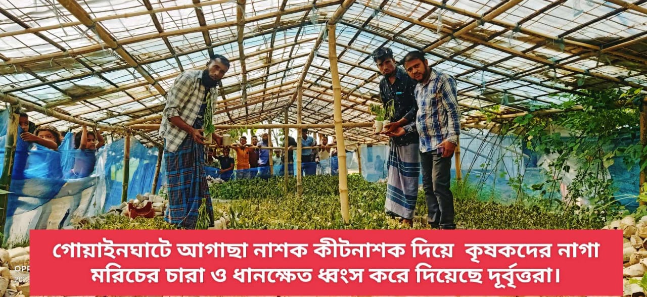 কীটনাশক দিয়ে ১০জন  কৃষকদের নাগা মরিচের চারা এবং ধানক্ষেত ধ্বংস করে দিয়েছে দূর্বৃত্তরা ঘটনাটি ঘটেছে গোয়াইনঘাট উপজেলার ৫নং পূর্ব আলীরগাঁও ইউনিয়নের নয়াগ্রাম উত্তর এলাকায়। গত বুধবার দিবাগত রাতের যে কোন এক সময় এঘটনা ঘটেছে বলে ক্ষতিগ্রস্তরা জানিয়েছেন।  এঘটনায় ক্ষতিগ্রস্ত কৃষক মো: আব্দুন নুর বাদী হয়ে গোয়াইনঘাট থানায় একটি লিখিত অভিযোগ দাযের করেছেন।