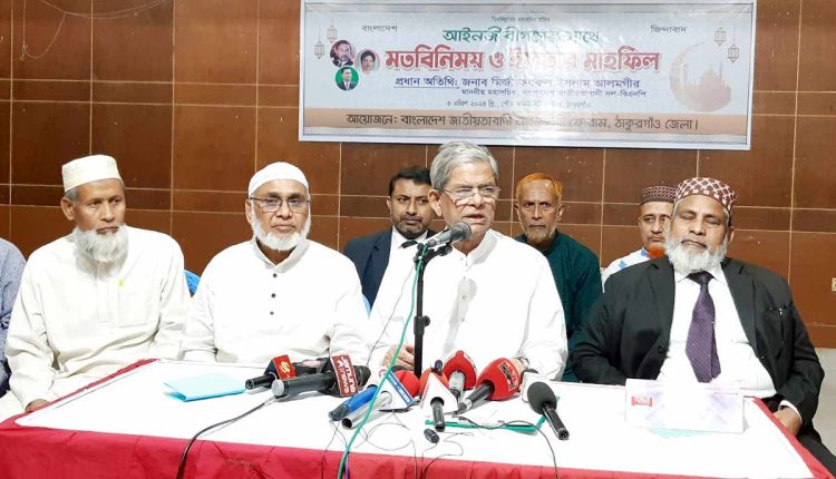 সংবিধান ও জনগণের অধিকার বিষয়ে মির্জা ফখরুল আরও বলেন, আমরা এ দেশে ৭১ সালের যে স্বাধীনতার চেতনা, গণতান্ত্রিক রাষ্ট্রব্যবস্থা, গণতান্ত্রিক সমাজব্যবস্থা, সেটা প্রতিষ্ঠার জন্য আমরা সংগ্রাম করেছি, লড়াই করেছি। গত প্রায় ২ যুগ ধরে আমাদের দেশে সংবিধানকে কাটছাট করে মানুষের অধিকার, ভোটের অধিকার, অন্নের অধিকার, বস্ত্রের অধিকার, তার বেঁচে থাকার অধিকার এবং মুক্ত পরিবেশে কথা বলার অধিকারকে কেরে নেওয়া হয়েছে। আজকে শাসক গোষ্ঠী এই আওয়ামী লীগ অতীতে যখন ক্ষমতায় ছিল তখন সমস্ত দলগুলোকে বন্ধ করে একদলীয় শাসন ব্যবস্থা প্রতিষ্ঠা করেছিল। আজকে আবার একই কায়দায় বাংলাদেশের একদলীয় শাসন ব্যবস্থা প্রতিষ্ঠা করে চলেছে। আমরা রাজনৈতিক দলগুলোর পক্ষ থেকে লড়াই করছি, সংগ্রাম করছি। আমাদের চেয়ারপার্সন দেশনেত্রী বেগম খালেদা জিয়া অত্যন্ত অসুস্থ অবস্থায় বন্দী জীবন যাপন করছে। ৩০ হাজারেও বেশি নেতা কর্মী কারাগারে নিক্ষেপ করা হয়েছিল। বিভিন্ন মামলায় প্রায় দেড় হাজার মামলায় সাজাপ্রাপ্ত হয়েছে। বাংলাদেশ জাতীয়তাবাদী আইনজীবী ফোরাম ঠাকুরগাঁও জেলা শাখার আয়োজনে অনুষ্ঠিত মতবিনিময় ও ইফতার মাহফিলে অন্যান্যের মধ্যে উপস্থিত ছিলেন, জেলা বিএনপির সাধারণ সম্পাদক মির্জা ফয়সল আমীন, জেলা আইনজীবী সমিতির সভাপতি এ্যাড. আব্দুল হালিম, সাধারণ সম্পাদক এ্যাড. মো: জয়নাল আবেদীন, এ্যাড. মো: ফজলে আলম, এ্যাড. মো: সারোয়ার হোসেন সহ অন্যান্য আইনজীবীবৃন্দ।