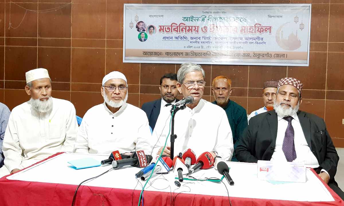 বিএনপি মহাসচিব মির্জা ফখরুল ইসলাম আলমগীর বলেছেন, চরম ফ্যাসিবাদী পরিস্থিতিতে বাংলাদেশের মানুষের জীবন অতীষ্ট হয়ে গেছে। আজকে যেটা প্রয়োজন, সেটা হলো জাতীয় ঐক্য। সমস্ত জাতি আজ ঐক্যবদ্ধ হয়ে ফ্যাসিবাদের বিরুদ্ধে, ফ্যাসিস্ট সরকারের বিরুদ্ধে সংগ্রাম করবে। এটাই আজকে আমাদের মুক্তির একমাত্র পথ। এখানে কোন ব্যক্তি বা দল বড় কথা নয়। আজকে আমাদের অধিকারকে প্রতিষ্ঠা করাই সবচেয়ে বড় বিষয়। তিনি ৩ এপ্রিল বুধবার বিকেলে পৌর কমিউনিটি সেন্টারে বাংলাদেশ জাতীয়তাবাদী আইনজীবী ফোরামের মতবিনিময় ও ইফতার মাহফিলে প্রধান অতিথির বক্তব্যে উপরোক্ত কথা বলেন। মির্জা ফখরুল বলেন, সংবিধানের নিয়মে কোন কাজ বর্তমানে পালন করা হয় না। সকলে অবশ্যই লক্ষ্য করেছেন গোটা দেশ এখন দুর্নীতিতে সয়লাব হয়ে গেছে। আমাদের রাষ্ট্রযন্ত্রগুলোকে প্রত্যেকটিকে দলীয়করণ করা হয়েছে। যার ফলে আজকে মানুষ একটা অসহায় অবস্থার মধ্যে আছে। সে আইনের শাসন থেকে বঞ্চিত। বিচার ব্যবস্থায় দলীয়করণ করা হয়েছে। আইন শৃংখলা রক্ষাকারী বাহিনী দলীয়। সার্বিকভাবে সমস্ত রাষ্ট্রকে একটা দলীয় রাষ্ট্রে পরিনত করেছে। নির্বাচনকে একটা প্রহোসনে পরিনত করেছে। সে নির্বাচনকে সবাই এখন বলে ডামি নির্বাচন হয়েছে। তারা নিজেরাই এ নির্বাচন করেছে। বিরোধী দল এ নির্বাচনে অংশগ্রহন করেনি।