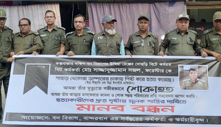 কক্সবাজারের উখিয়ার রাজাপালং ইউনিয়নের হরিণমারা এলাকায় বন রক্ষায় অভিযান চালাতে গিয়ে মাটি পাচারকারীদের ডাম্পারের (মিনি ট্রাক) চাপায় খুন হওয়া বনবিট কর্মকর্তা সাজ্জাদুজ্জামান সজলের হত্যার প্রতিবাদে ও দ্রুত সময়ে দোষীদের গ্রেফতারের দাবিতে বান্দরবানে মানববন্ধন অনুষ্ঠিত হয়েছে।