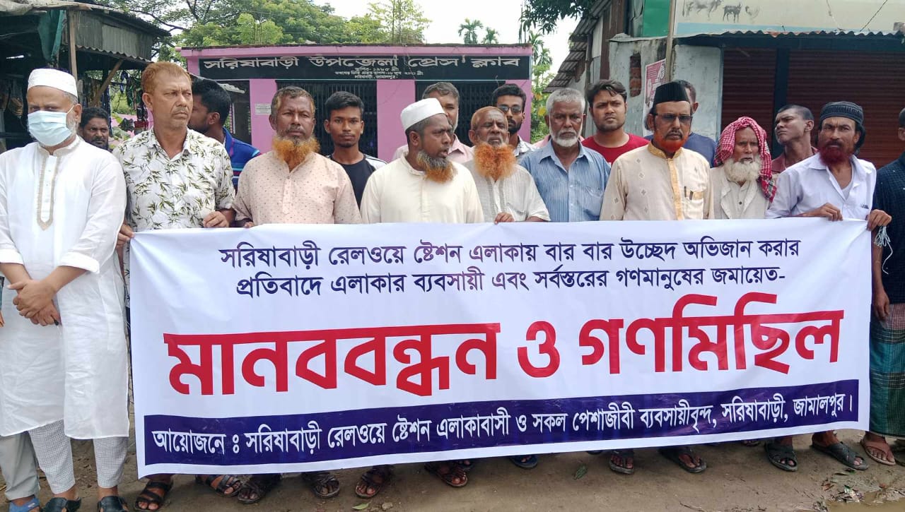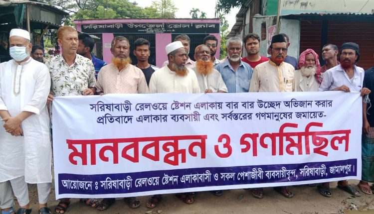সরিষাবাড়ী ষ্টেশন এলাকায় রেলওয়ে’র কর্তৃপক্ষের উচ্ছেদ অভিযানের সিদ্ধান্তের প্রতিবাদে মানববন্ধন-গণ মিছিল, সমাব্শে ও স্বরকলিপি পেশ