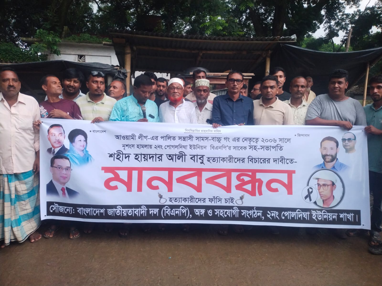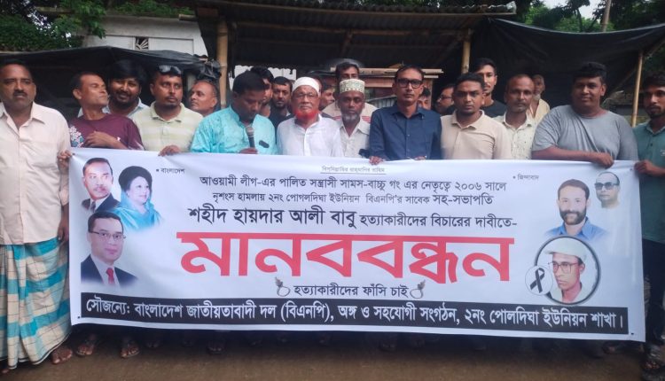 মানববন্ধন কর্মসূচিতে বক্তারা বলেন, পোগলদিঘা ইউনিয়ন বিএনপির সহ সভাপতি হায়দর আলী বাবু কে ২০০৬ সালের ৩০ নভেম্বর নৃশংসভাবে হত্যা করে সাবেক ইউপি চেয়ারম্যান সামস উদ্দিন সামস ও তার সন্ত্রাসাী বাহিনী। এ ঘটনায় আওয়ামী নেতা ও সাবেক ইউপি চেয়ারম্যান সামস উদ্দিন সামস কে প্রধান আসামি করে সরিষাবাড়ী থানায় হত্যা মামলা দায়ের করেন নিহতের স্ত্রী দিলরুবা আক্তার ময়না। এরপর আওয়ামী লীগের দলীয় প্রভাব খাটিয়ে মামলাটি খারিজ করানো হয়। ন্যায় বিচায় থেকে বঞ্চিত হয় বাবুর পরিবার। বর্তমানে যেহেতু আইনের শাসন প্রতিষ্ঠিত হয়েছে। তাই বিএনপি নেতা হায়দর আলী বাবু হত্যার পুনরায় বিচারের দাবিতে চলতি বছরের ২৫ সেপ্টেম্বর নিহতের ছেলে ইজাজ আহমেদ কৌশিক বাদী হয়ে আদালতে একটি হত্যা মামলা দায়ের করেন। দায়ের করা মামলায় সাবেক ইউপি চেয়ারম্যান সামস উদ্দীন কে প্রধান আসামি করে ১৫ জনের নাম উল্লেখ করে তাদের বিরুদ্ধে মামলা দায়ের করেন। মামলাটি তদন্ত করে হত্যাকারীদের বিচার দাবী জানান তারা।