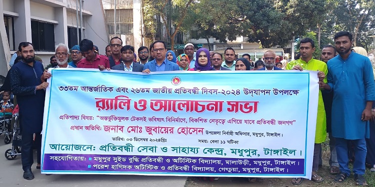 “অন্তর্ভুক্তিমূলক টেকসই ভবিষ্যৎ বিনির্মাণে, বিকশিত নেতৃত্বে এগিয়ে যাবে প্রতিবন্ধী জনগণ” এই প্রতিপাদ্যকে সামনে রেখে টাঙ্গাইলের মধুপুরে আন্তর্জাতিক ও জাতীয় প্রতিবন্ধী দিবস উপলক্ষে বর্ণাঢ্য র‌্যালি ও আলোচনা সভা অনুষ্ঠিত হয়েছে।