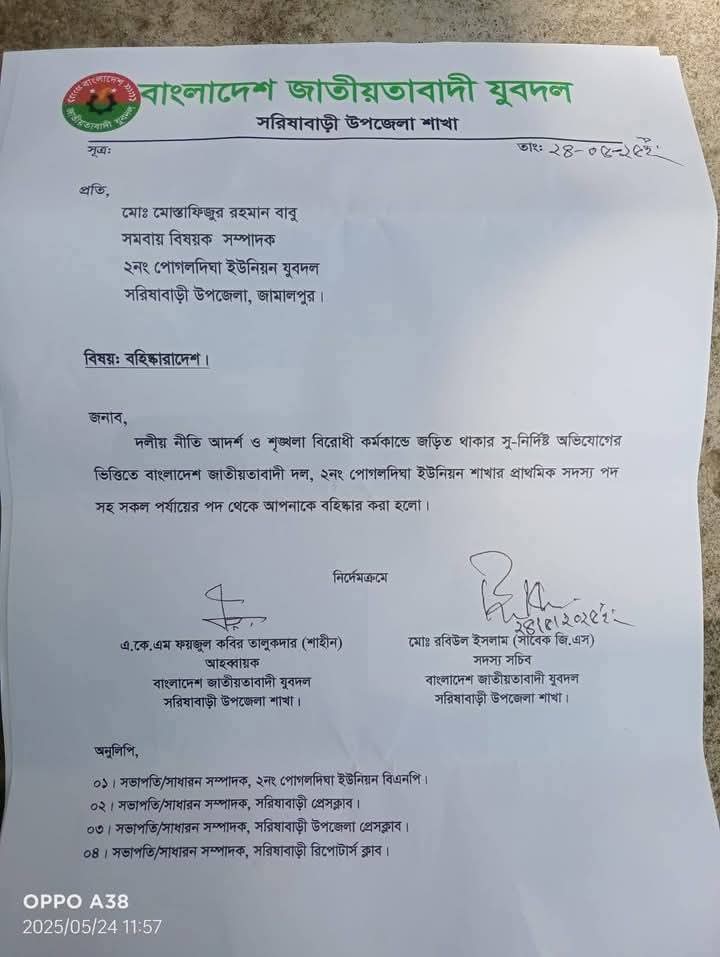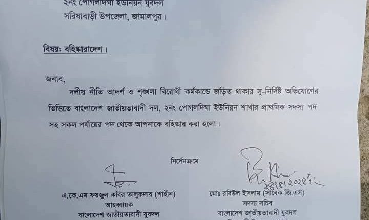 এদিকে জামালপুর জেলা বিএনপির সভাপতি ও সরিষাবাড়ী উপজেলা বিএনপির সাধারণ সম্পাদক ফরিদুল কবীর তালুকদার শামীম জানান, ব্যক্তির দায় ভার কখনো দল নিবে না। ৩ জনকে বহিষ্কার করা হয়েছে। ২ জনকে ভিডিওতে দেখা গেলেও ওই ভিডিওতে একজনকে ৬ হাজার টাকার চাইল পাইতাছো, ২০০ টাকা দিতে কি সমস্যা?’ এ কথা বলতে শুনা গিয়েছে। যে কন্ঠটি পোগলদিঘা ইউনিয়ন যুবদলের সমবায় বিষয়ক সম্পাদক মো: মোস্তাফিজুর রহমান বাবুর। তাই তাকেও বহিষ্কার করেছে যুবদল।